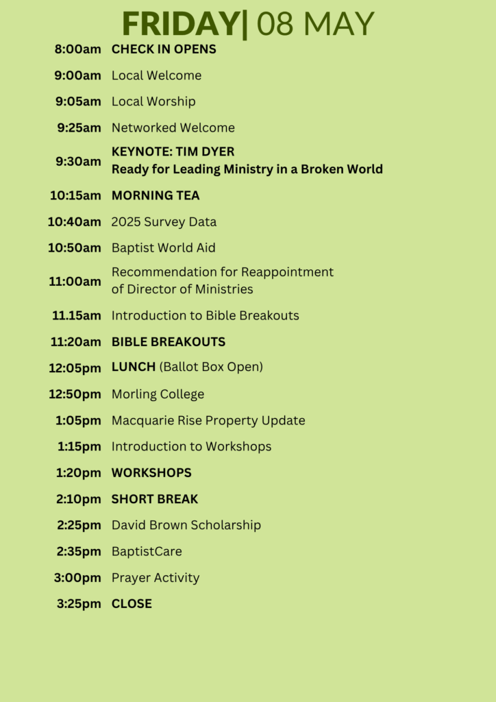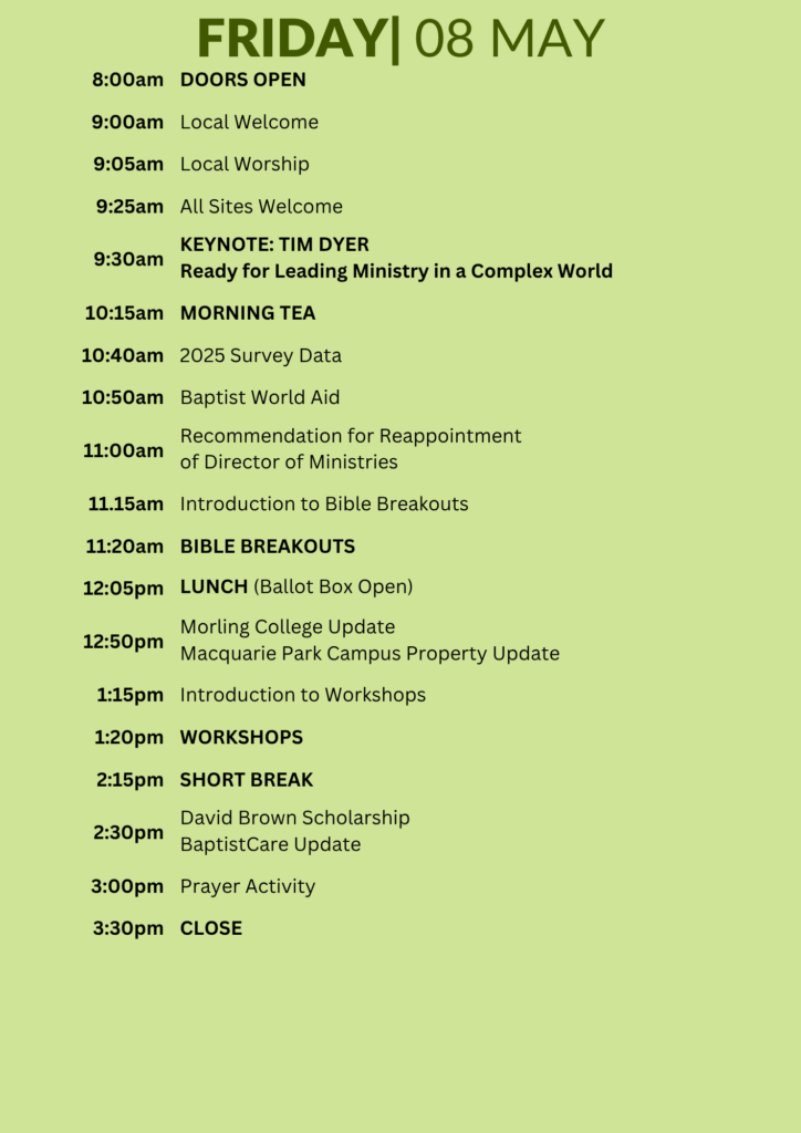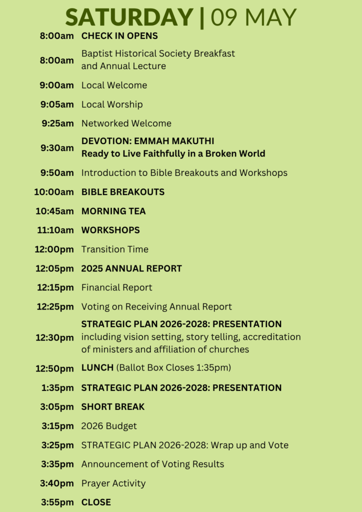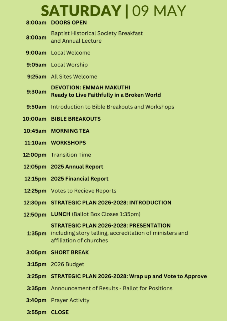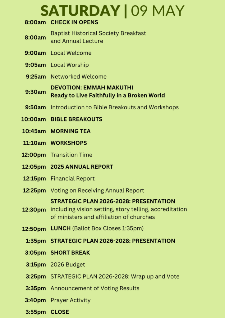 As part of this shared moment, The Gathering will also include our 158th Annual Assembly. Together, we will celebrate and affirm those proceeding to Accreditation, welcome new Affiliated Churches, prayerfully consider and approve the 2026 budget, respond to a recommendation regarding the reappointment of the Director of Ministries and appoint leaders to serve on the Assembly Council, Morling College Council and Baptist Churches of NSW Property Trust — all as we seek to move forward with clarity, unity and readiness for what God has ahead.